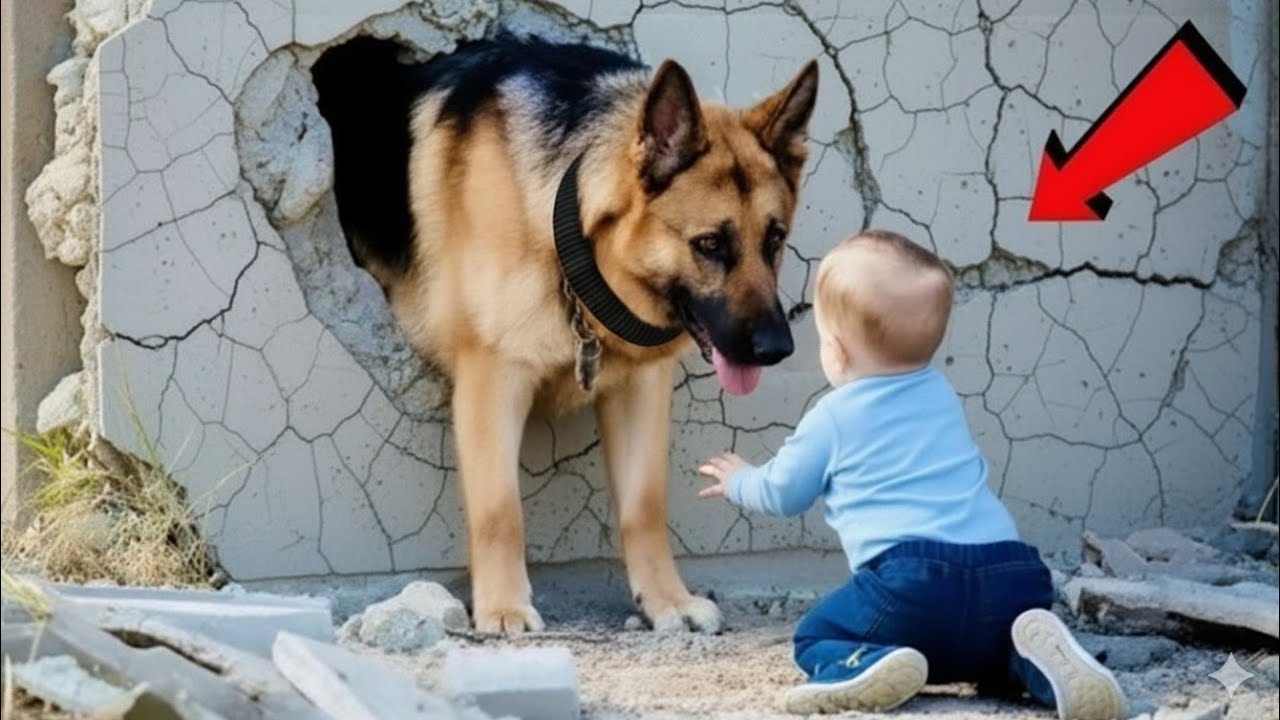 Baby found a German Shepherd cemented in a wall. What he did next left everyone in tears. The crack didn’t sound like a normal crack. It sounded alive. 2-year-old Liam froze midc crawl. Tiny palms pressed into the dusty ground behind the old backyard shed. The adults never walked back here. The cement walls were cracked.