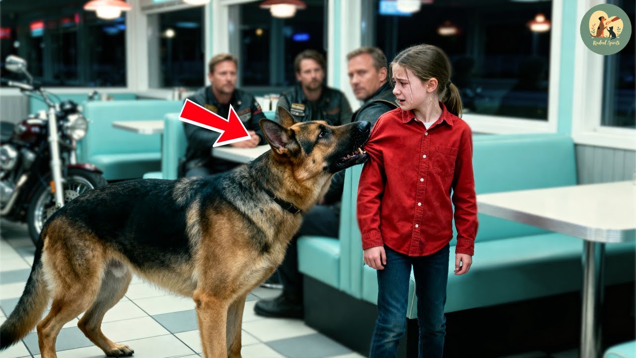 The dog, 90 lbs of muscle and determination, maintained a gentle but unbreakable grip on the girl’s sleeve, pulling her toward the back corner booth, its ears pinned flat. The animal released three sharp staccato barks that cut through the dinner conversation like gunshots. Three leatherclad bikers at the window table turned in unison.