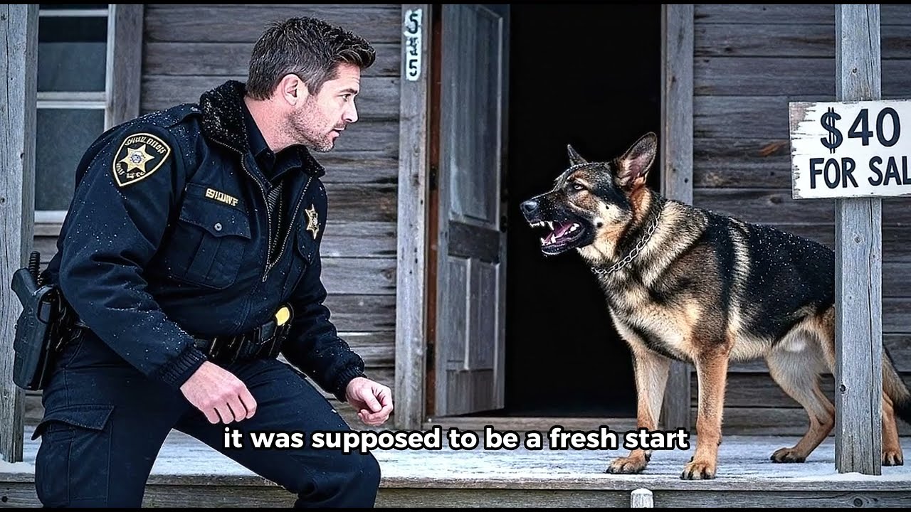 The road ended miles before the map did. Trees swallowed the sky and his tires crunched through frost as the old cabin came into view, leaning, broken, and silent. The porch sagged under its own weight. The front door creaked open, though the wind was still. Mark stepped closer, but froze. German Shepherd stood in the doorway, hackles raised, teeth bared, its eyes locked onto his badge like it recognized him.