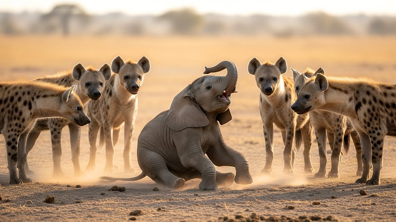 A pack of six hyenas had tightened their ring around a terrified elephant calf in the center of a sunbaked clearing. The little one was small, barely 3 months old, twirling in circles and crying out frantically for a mother who was nowhere to be found. The pack leader, a massive male with a jagged scar across his nose, lunged forward, snapping his teeth at the calf’s trembling legs.