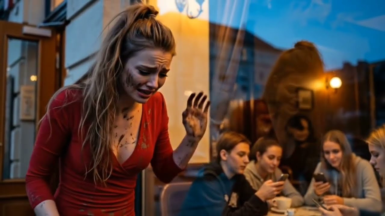 Maybe he wasn’t ready. Maybe movement outside the glass caught his eye. A young woman stood just beyond the cafe entrance, visible through the glass door. She wasn’t coming in. She was just standing there. and she was completely covered in mud from her knees down with splatters across what looked like it had once been a red dress.