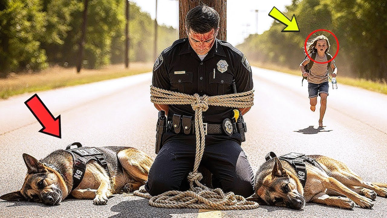 A police officer was tied to a wooden post, rope digging deep into his arms. His lips were cracked, his uniform drenched in sweat. Beside him, two German Shepherds lay motionless, tongues dry, fur blazing under the heat. “Sir,” Lily’s voice trembled. “Can you hear me?” The officer’s head tilted weakly. His voice was barely a whisper.